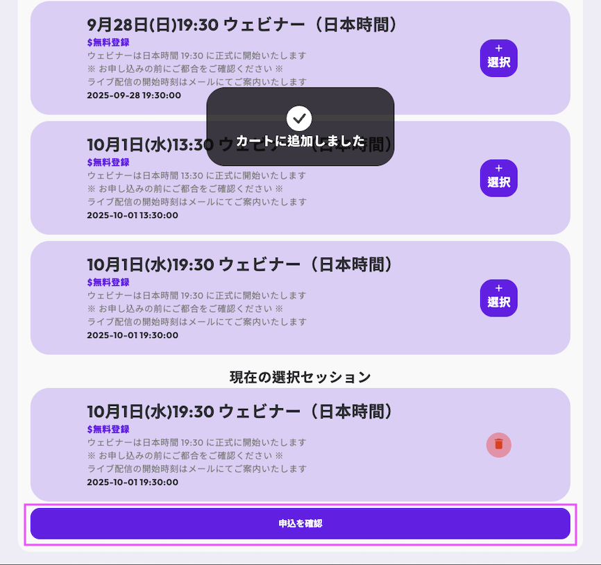 「選択」ボタンを押すと選択が完了し、「Added to cart」と表示されます。