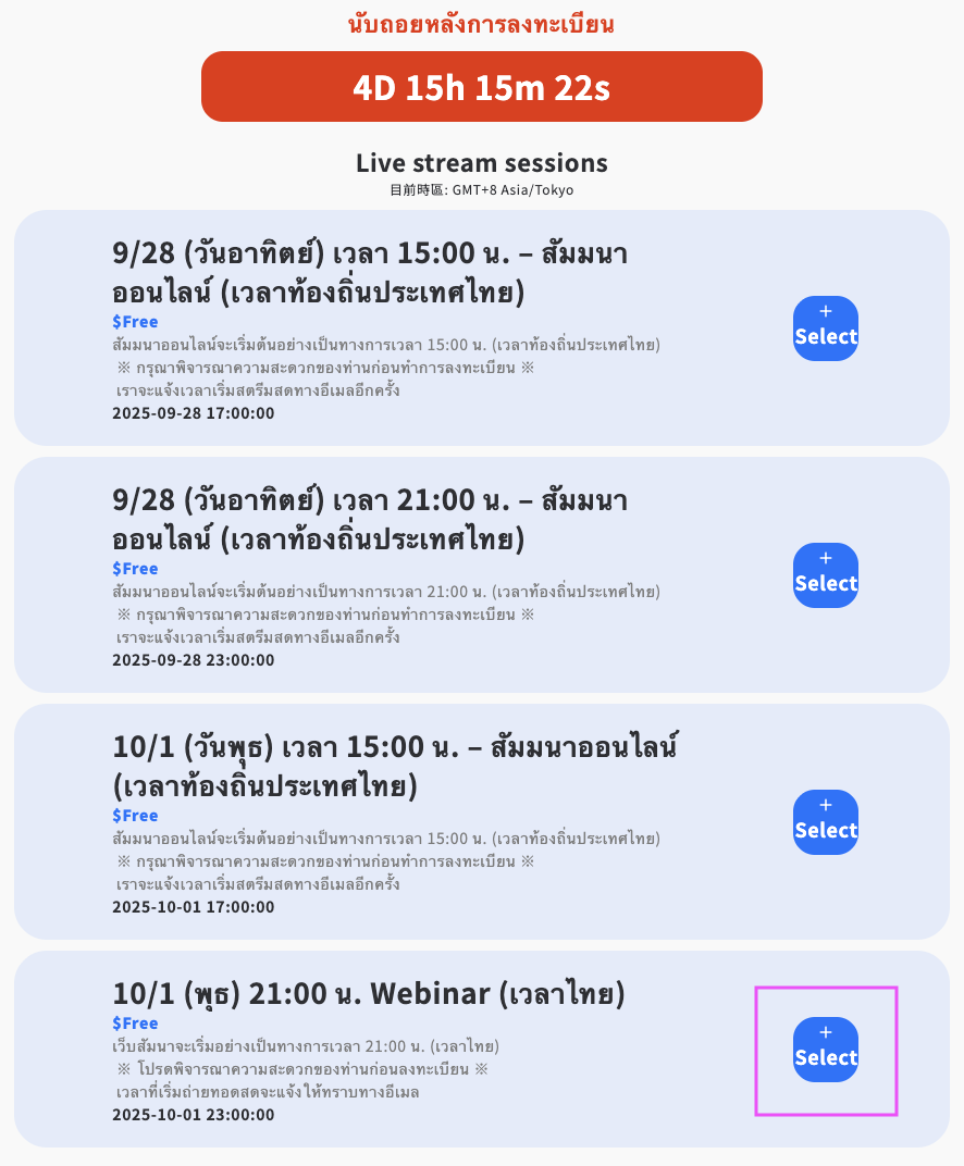 เลือกเซสชันที่ตรงกับตารางเวลาของคุณแล้วคลิกปุ่ม “Select”