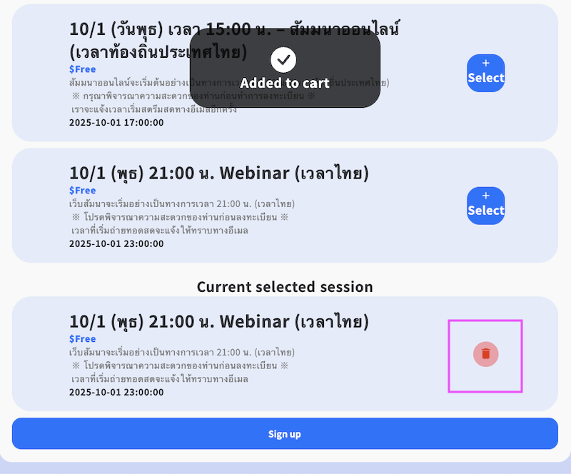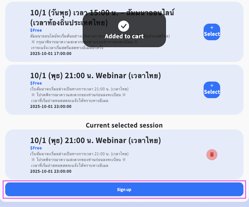 • หลังจากคลิก คุณจะเห็นข้อความ “Added to cart” หมายความว่าเซสชันของคุณถูกเลือกเรียบร้อยแล้ว