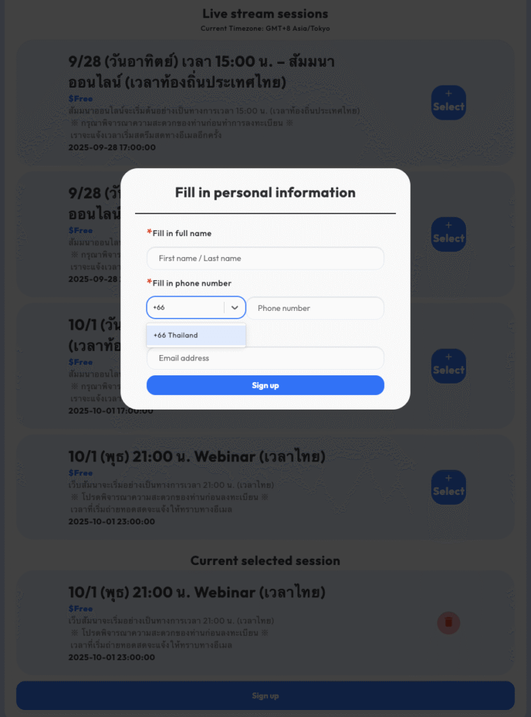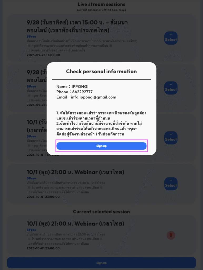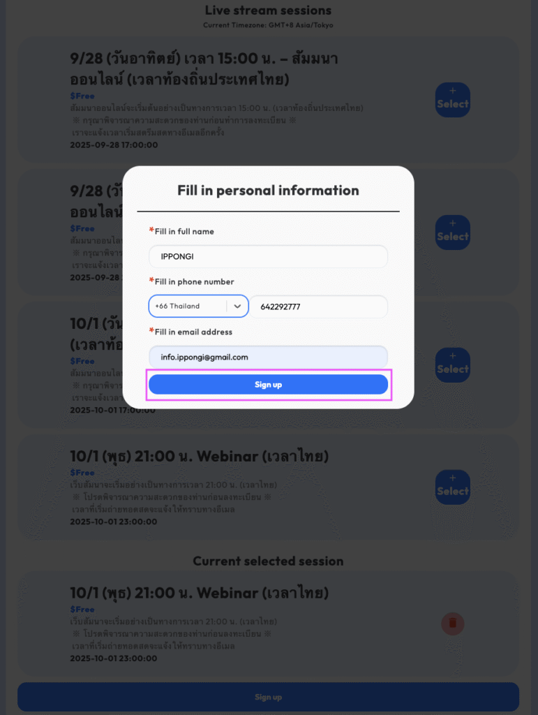 เมื่อคุณเลือกเซสชันเรียบร้อยแล้ว คลิกปุ่ม “Sign Up”