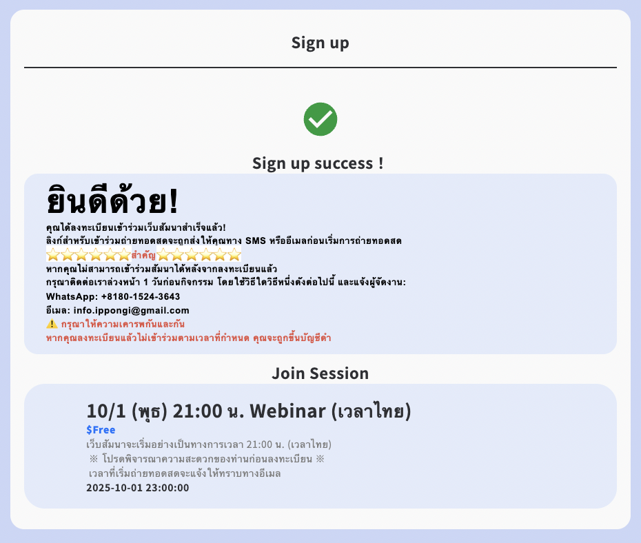 ⚠️ ข้อมูลที่ถูกต้องสำคัญมาก เพราะเราจะใช้ส่งลิงก์เข้าร่วมเว็บสัมมนาให้คุณทาง SMS หรืออีเมล
